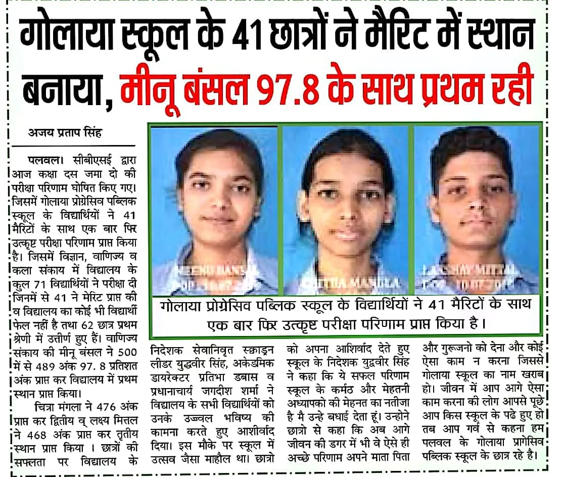 | Tuesday, 1 July 2025 | Dear parents Marksheets of class X have been received from CBSE. You can collect the same from Junior Wing Reception between 8 am and 1 pm on working days. It is mandatory for mother / father to come to school to put signature on the marksheet . Golaya Progressive Public School |