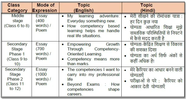 | Tuesday, 15 July 2025 | Dear parents CBSE is organizing an Expression Series on the theme Competency Focused Education. Details are as follows:  Note: 1. Paragraphs / Essays may be written in Hindi or English. 2. Shortlisted activity will be sent to CBSE. 3. The activity will be held in the school on Wednesday, 23 July 2025. It is mandatory to participate in this activity. Golaya Progressive Public School |