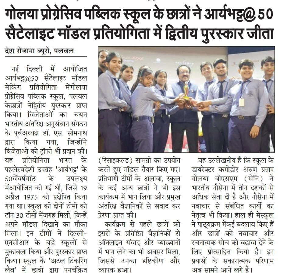 | Tusday, 22 April 2025 | Dear parents We are pleased to share a proud moment for our school. Our students have demonstrated excellence by securing second position in the Satellite Model making competition held at National level. Regards Golaya Progressive Public School |